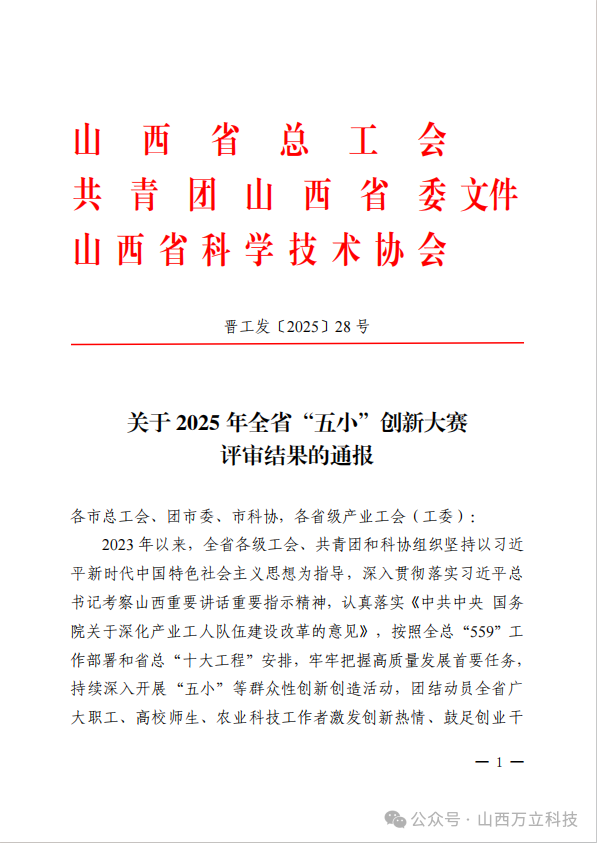 近日,山西省总工会、共青团山西省委、省科学技术协会联合下发了《2025年山西省五小优秀通报》(晋工发〔2025〕28号),对在全省“五小”竞赛活动中涌现出的优秀创新成果和先进单位进行通报表彰。我公司申报的创新项目荣获三等奖!